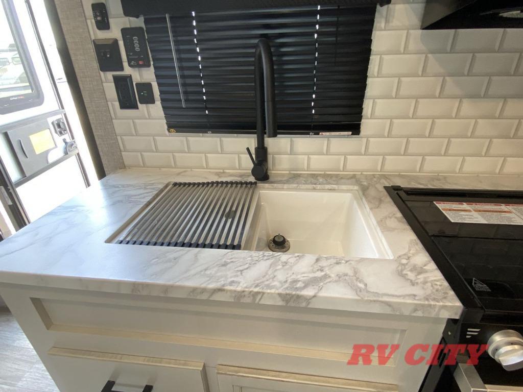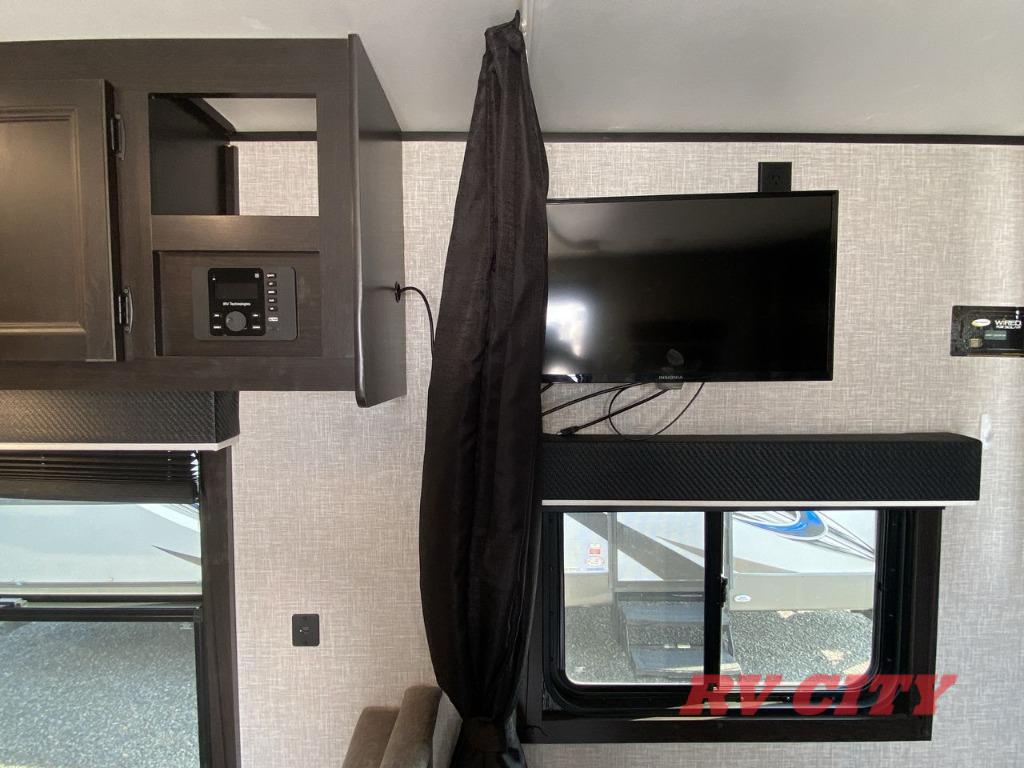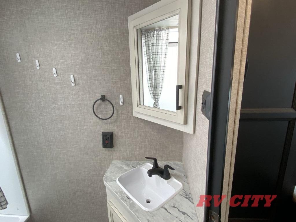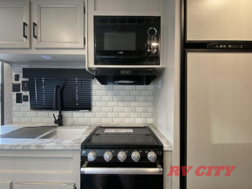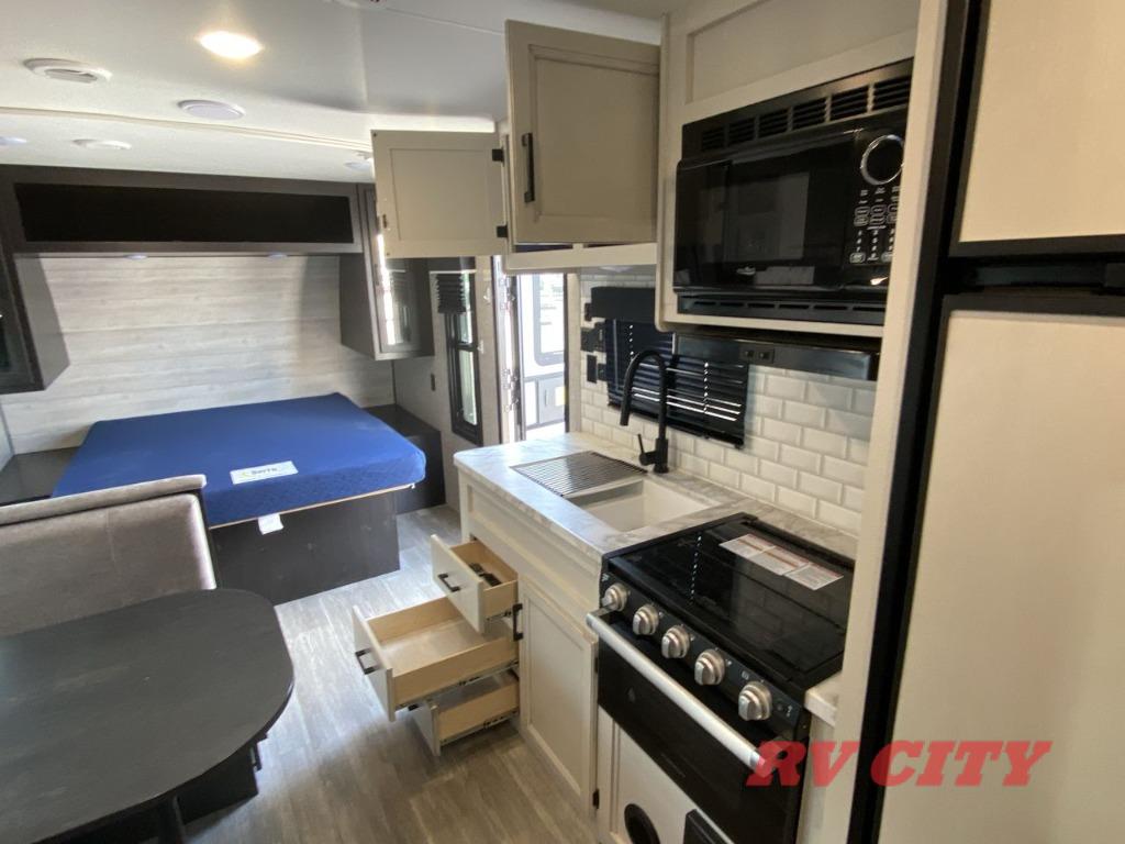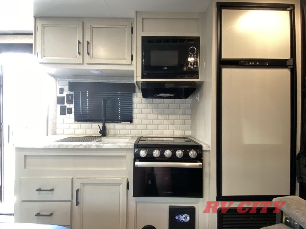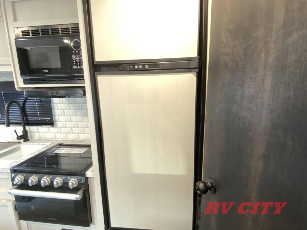 Get ready for family fun or a friend's weekend at the campgrounds in this trailer! This trailer offers full kitchen amenities including a pantry for snacks and such, plus a full rear corner bathroom for privacy and includes a shower. When you need a break, the semi-private bedroom up front offers a queen bed, dual wardrobes and a curtain to close, and the double size bunks offer a curtain to close as well. There is a 13' power awing with LED lights for you to enjoy this outdoor space into the night, plus exterior storage for your outdoor games and gear.