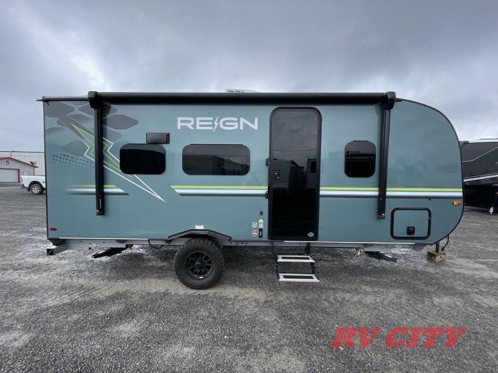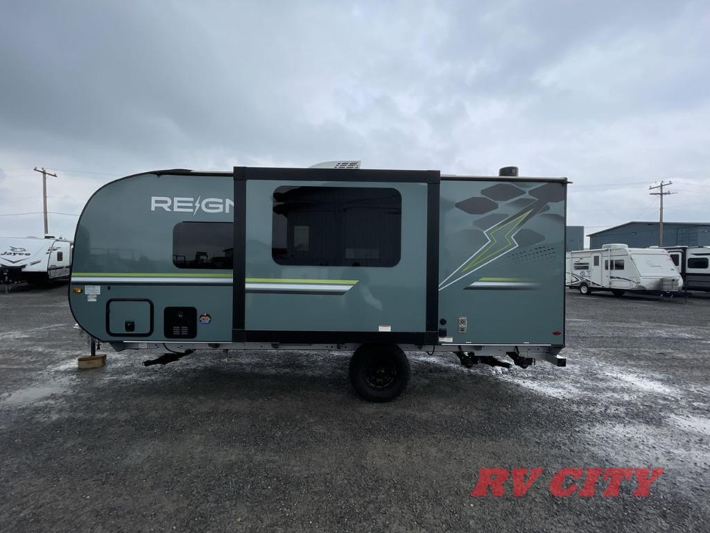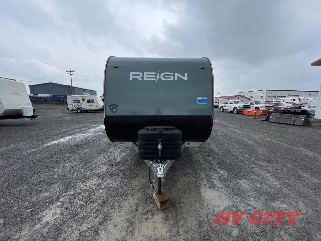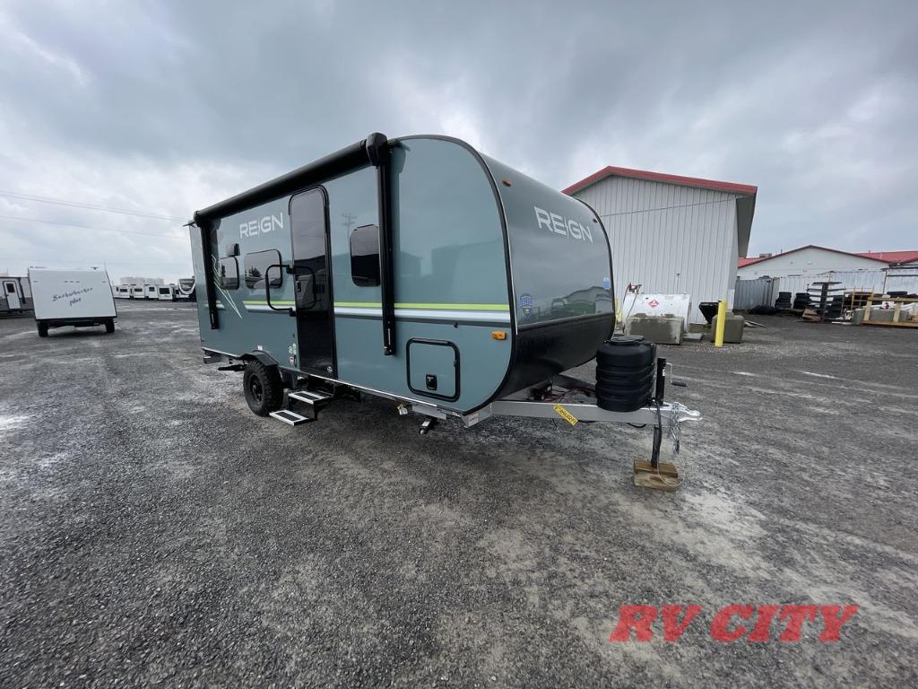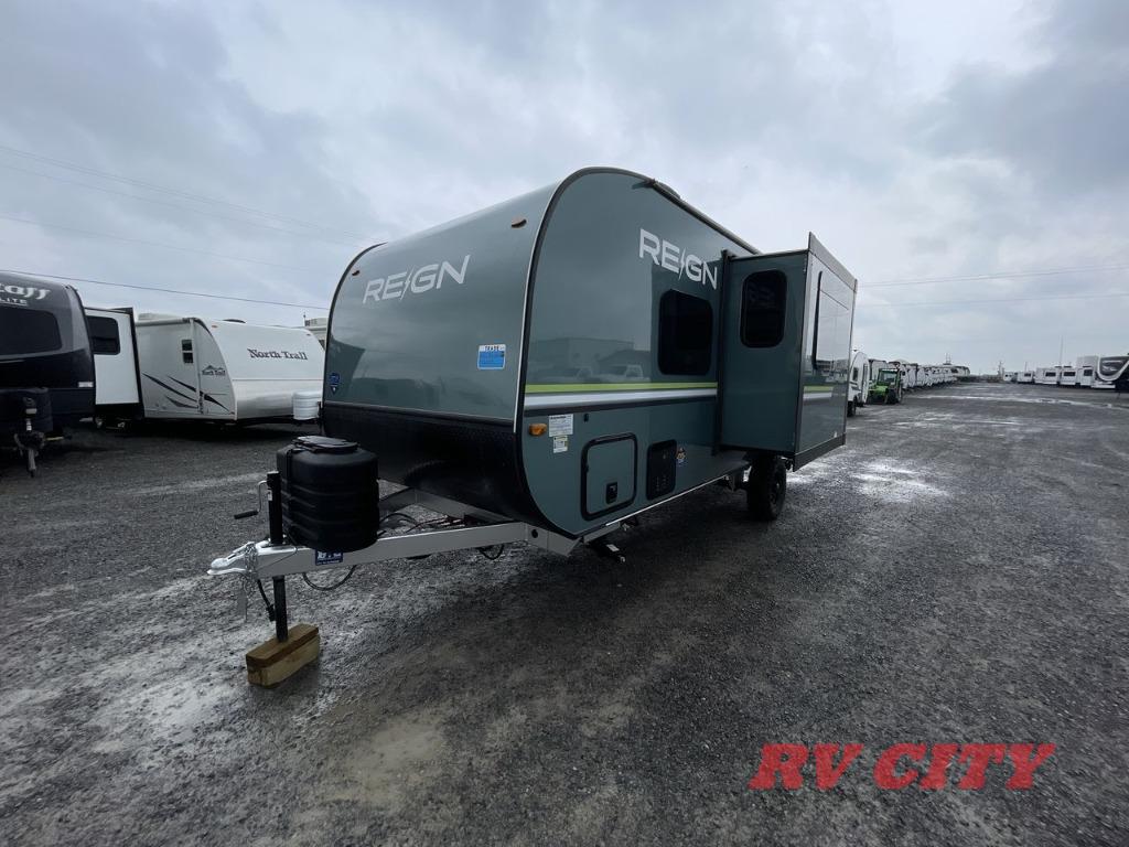 The Reign travel trailers by Keystone are premium single-axle units that are sure to make an impression at the campground. Each one is built with an exclusive automotive-finished aluminum exterior, a walkable roof, and a 100% composite floor for added durability. There are also tinted safety glass windows, quick drop stabilizer jacks, and an exterior shower with hot and cold water. The European inspired interior design is unique and cozy, and the 78" interior height will give you plenty of space to move about. You will also enjoy the ultra bright LED light strip and solid surface countertops in the kitchen, along with blackout night shades, and many more interior comforts.